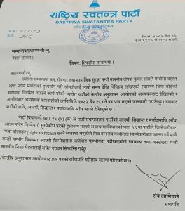 पार्टी सभापति रवि लामिछानेले प्रधानमन्त्री बालेन शाहलाई लेखेको पत्रमा भनिएको छ, ‘पार्टी विधानको धारा २५ ‘४’ ‘क’ ले पार्टी सभापतिलाई पार्टीको आदर्श, सिद्धान्त र मर्यादामाथि आँच आउन नदिन जिम्मेवारी सुम्पेको र पदको दुरुपयोग भएको अवस्थामा विधानको धारा ६९ मा पार्टीले जिम्मेवारीबाट फिर्ता बोलाउन ‘राइट टु रिकल’ को व्यवस्था भएकोले निज माननीय मन्त्रीलाई जिम्मेवारीबाट अलग गर्न सिफारिस गर्दछु ।’
