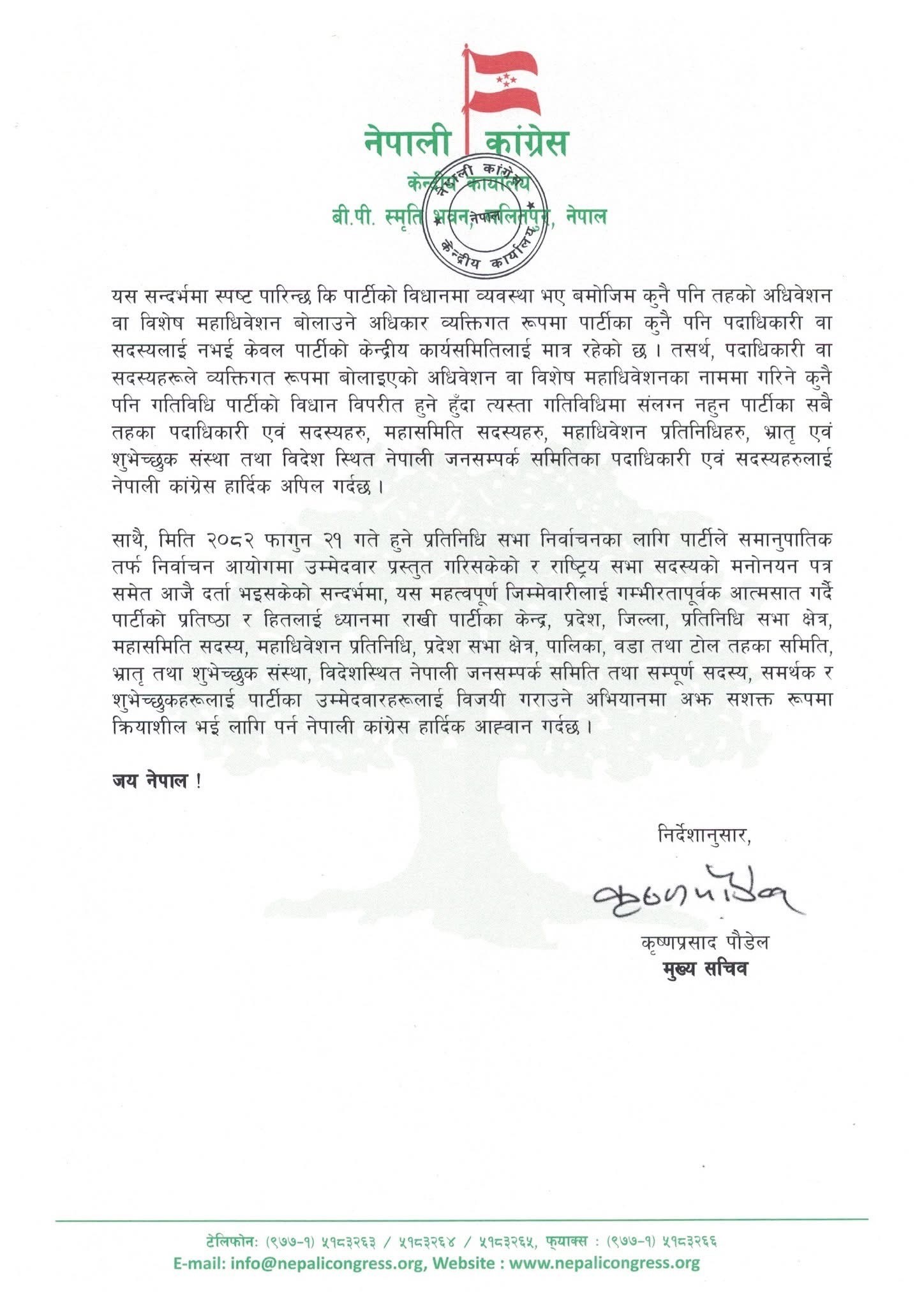 काठमाडौं । नेपाली कांग्रेसले पुस २७ र २८ गते आह्वान गरेको विशेष महाधिवेशन विधान विपरीत रहेको बताउँदै...