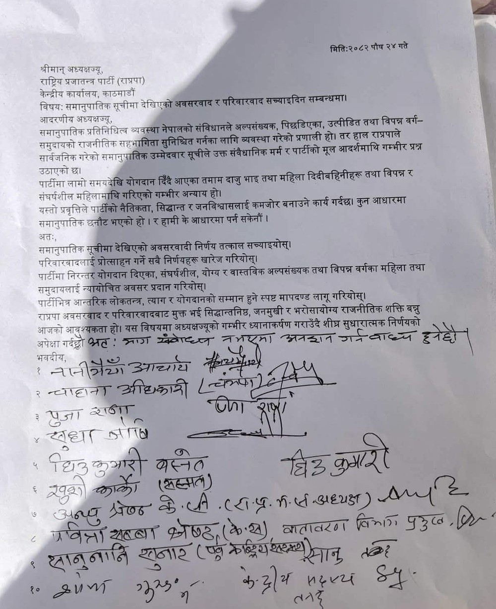 काठमाडौँ । राप्रपाका असन्तुष्ट पक्षका नेताहरुले पार्टीको समानुपातिक उम्मेदवारको सूची सच्याउन...